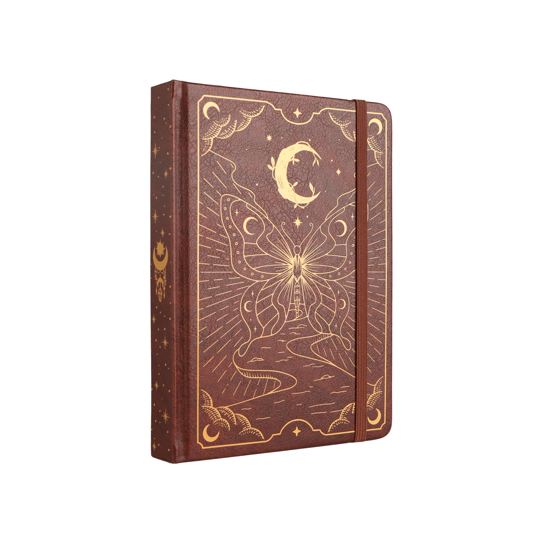 The cover features a mesmerizing celestial theme with a large butterfly, a glowing crescent moon, stars, and winding paths, presented in a stylish, warm brown palette with iridescent accents via stunning laser gold hot stamping. It comes with a matching spine decorated with a starry night sky and a moon - beneath dreamcatcher. Ideal for lovers of whimsical, celestial - inspired aesthetics.