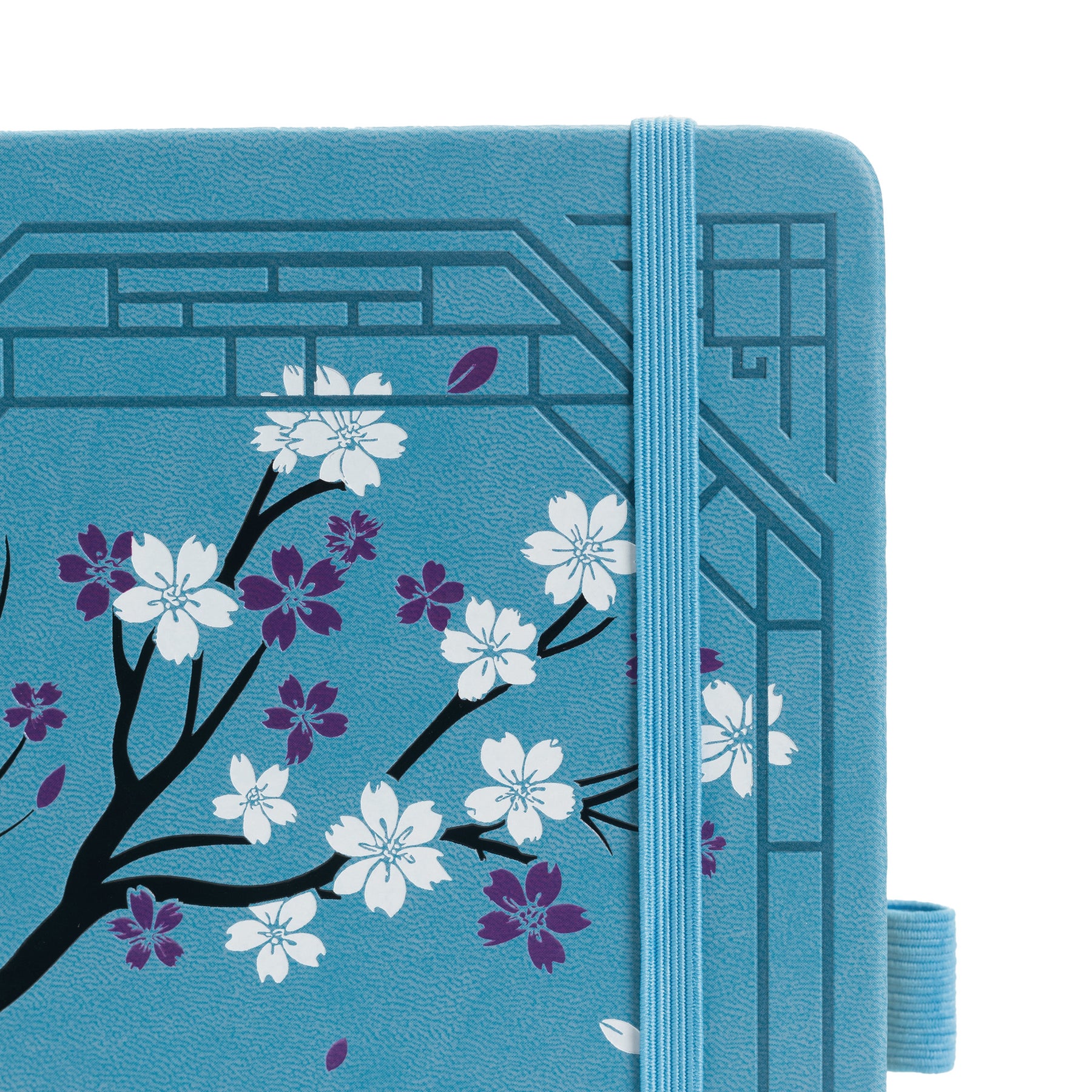 This A5 notebook features a soft blue cover adorned with an intricate artistic design. A black cat peacefully perches on a cherry blossom branch, framed by a geometric lattice window that evokes an elegant oriental atmosphere. Perfect for note-taking, sketching, or planning, combining aesthetic refinement with practical functionality.