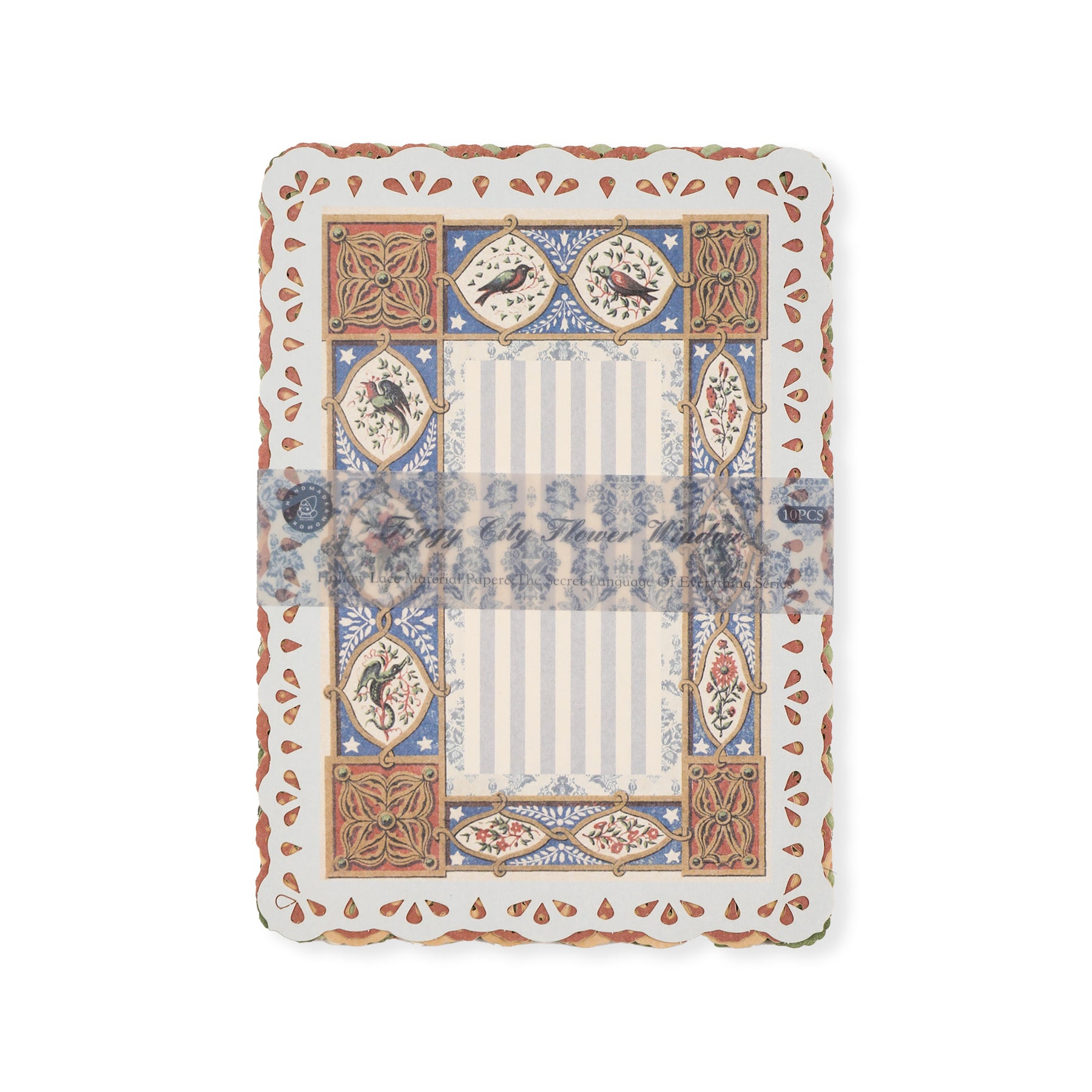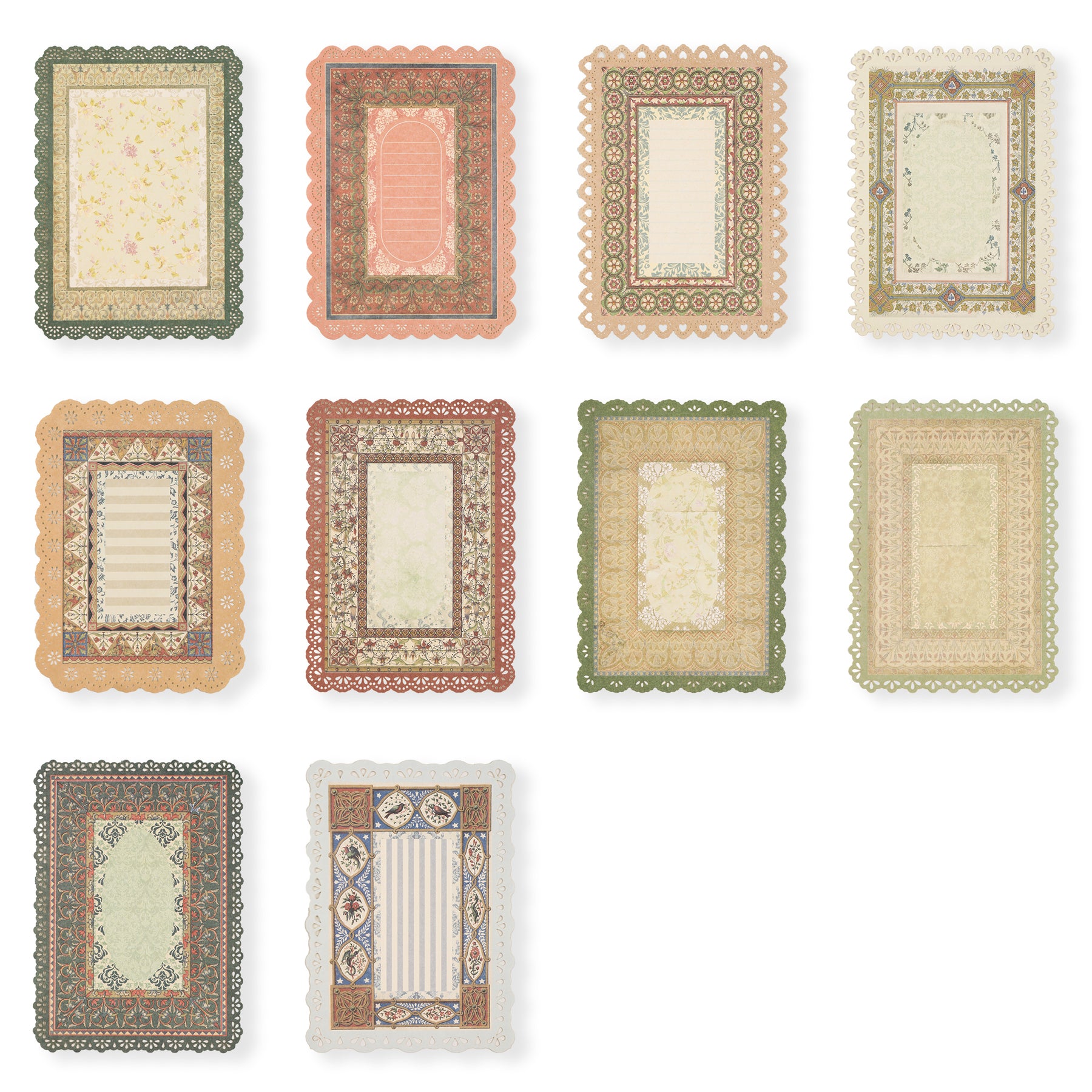 This set includes 10 sheets of vintage-style scrapbook paper featuring a flower window pattern that adds an authentic aged look. Each sheet is bordered with a delicate lace cutout design, enhancing its nostalgic charm. Ideal for crafting, journaling, or decorative projects, these papers bring a refined, antique aesthetic to your creative work.