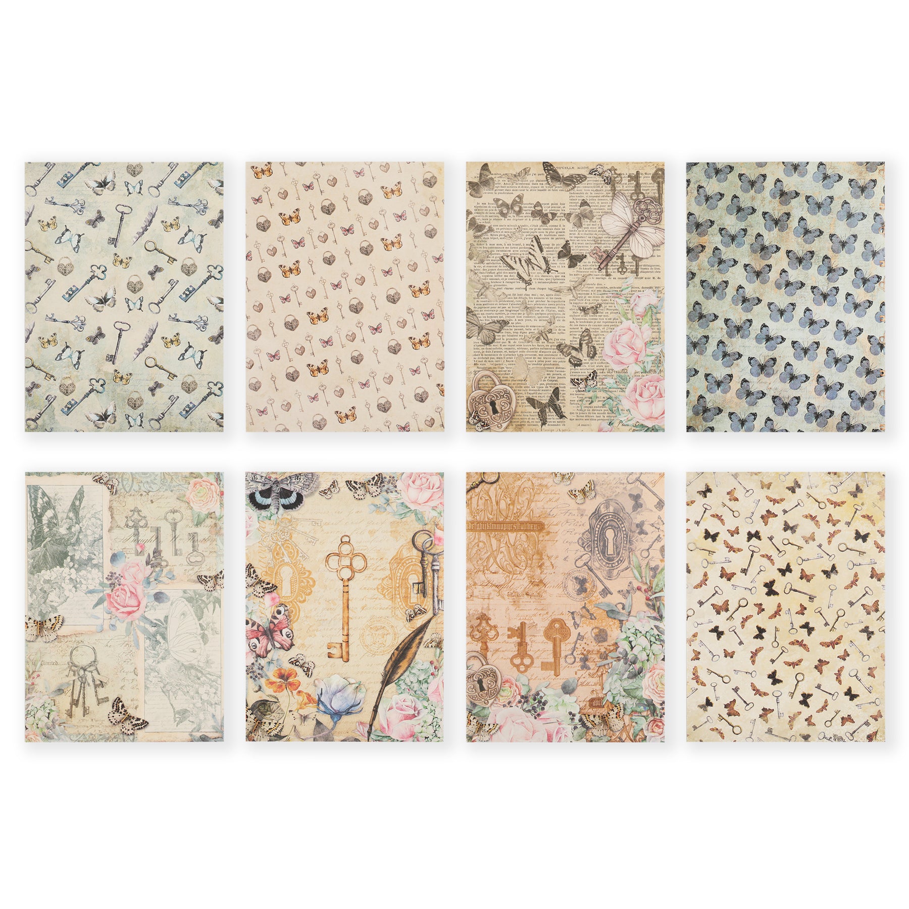 Discover the Golden Age Scrapbook Paper collection featuring 24 sheets with 8 distinct designs. Each design showcases elegant butterflies, vibrant flowers, and intricate keys, repeated across three sheets. Perfect for adding a refined vintage touch to your craft projects, these high-quality papers offer versatile creativity for scrapbooking, card making, and decorative art.