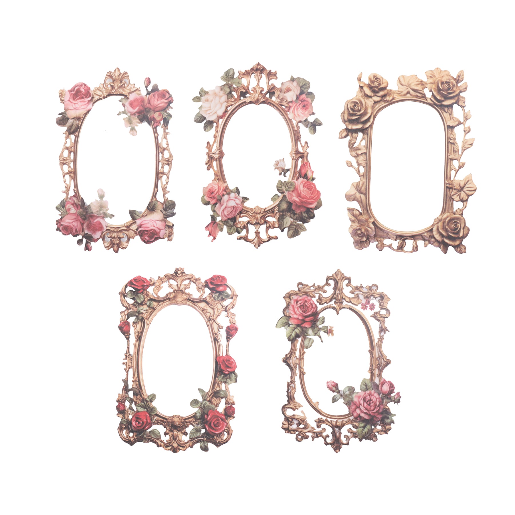 This set of Retro Flower Mirror scrapbook paper includes 10 sheets featuring five distinct vintage designs. Each design showcases intricate embossed and die-cut borders combined with elegant floral elements, with two sheets per pattern. Perfect for sophisticated scrapbooking and crafting projects that demand a classic, refined look.