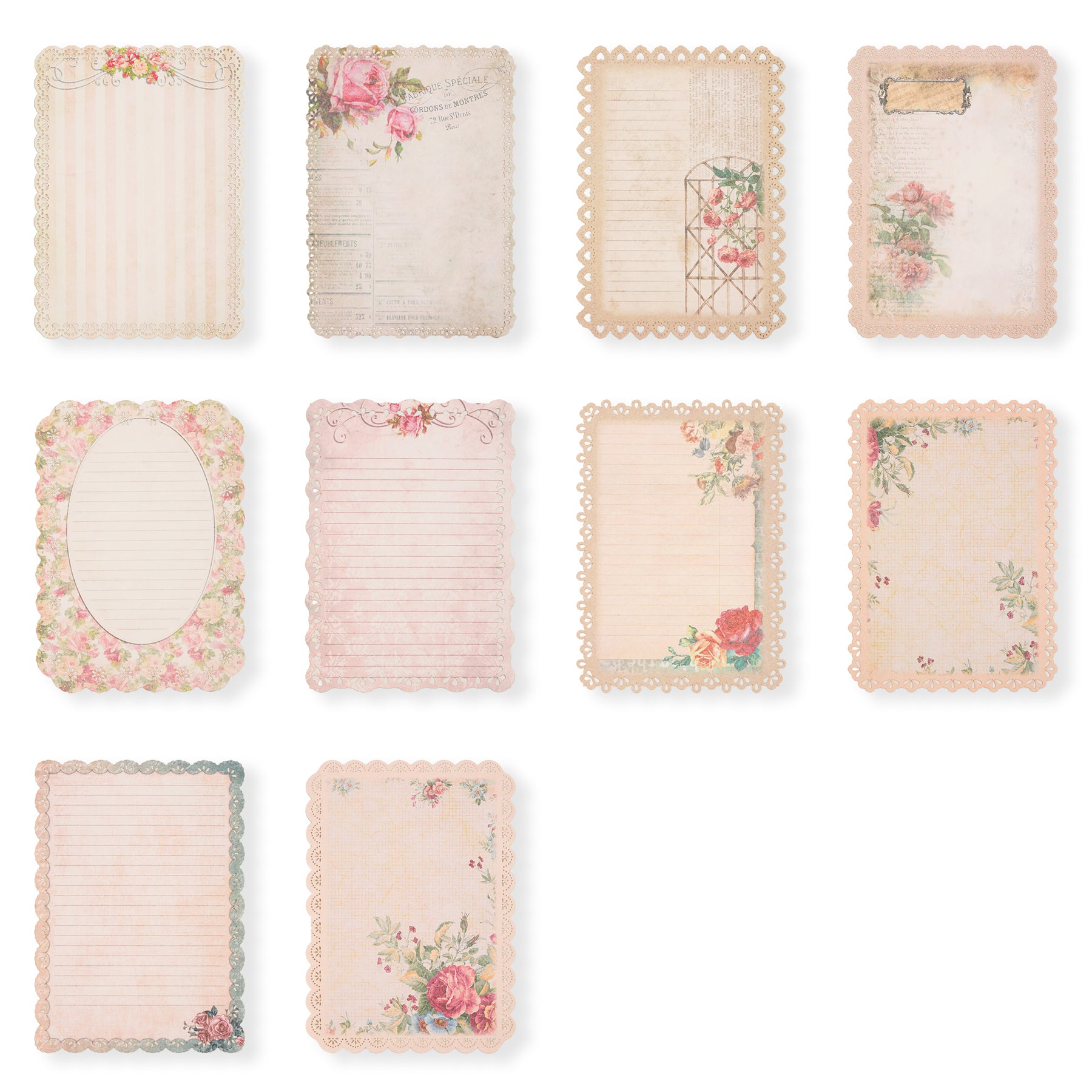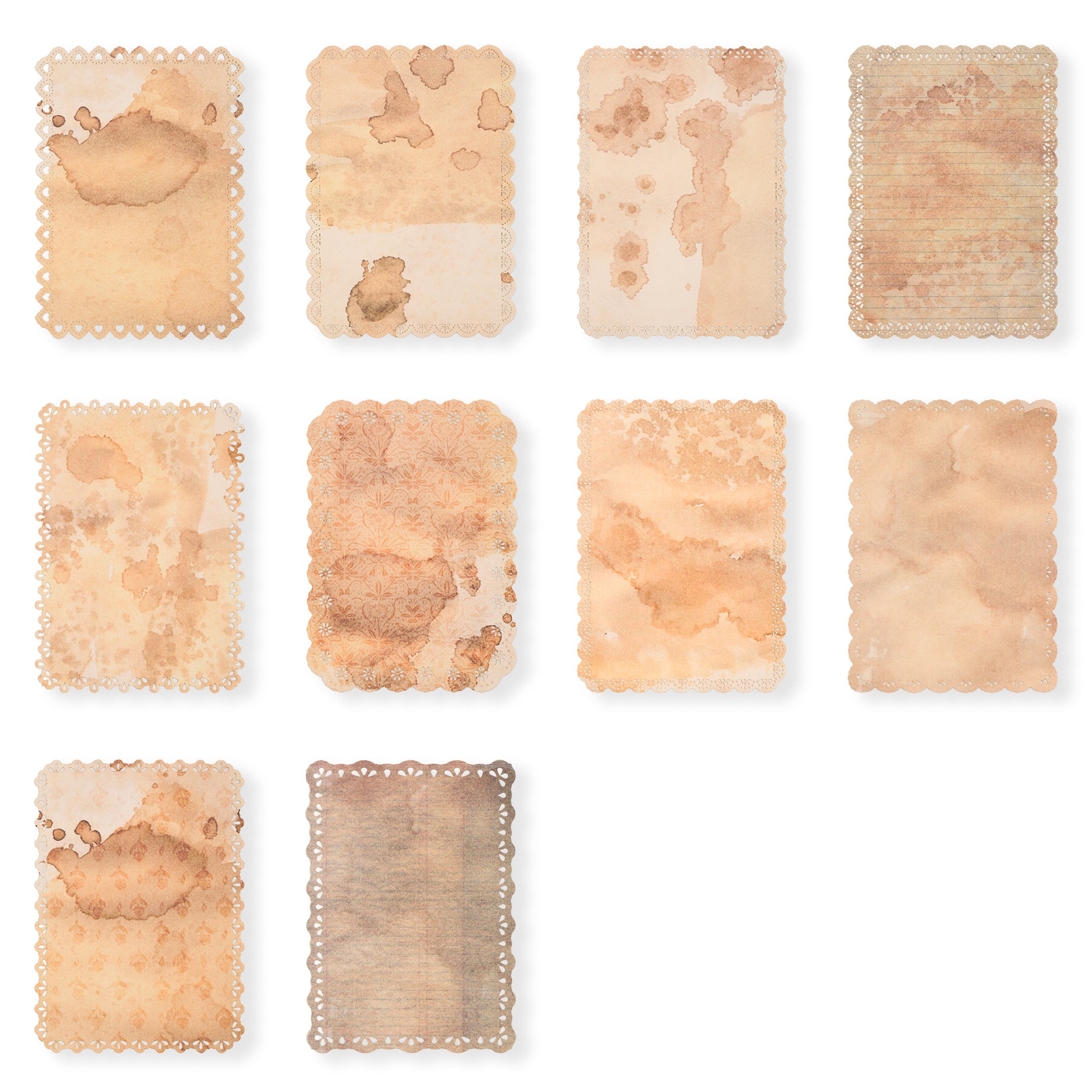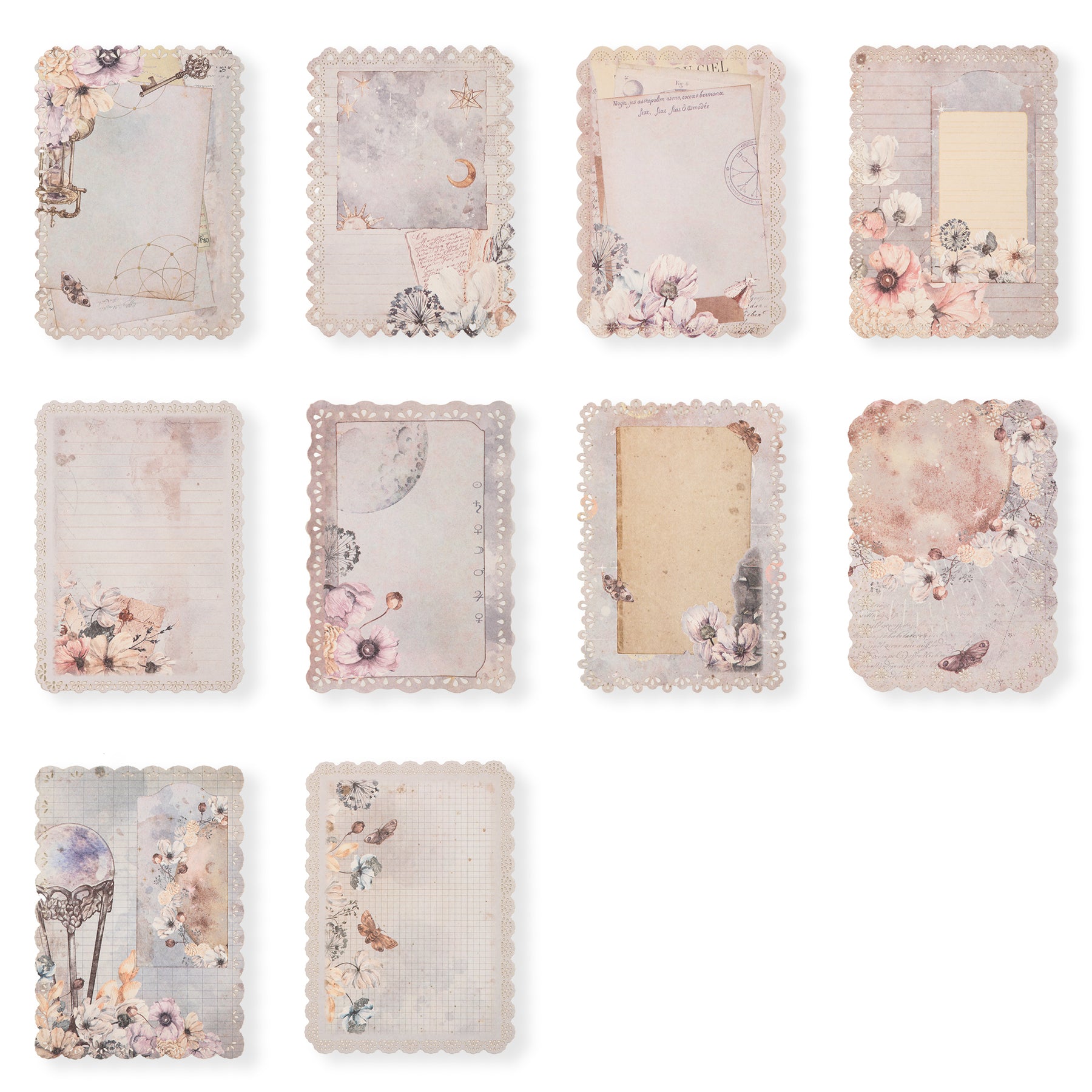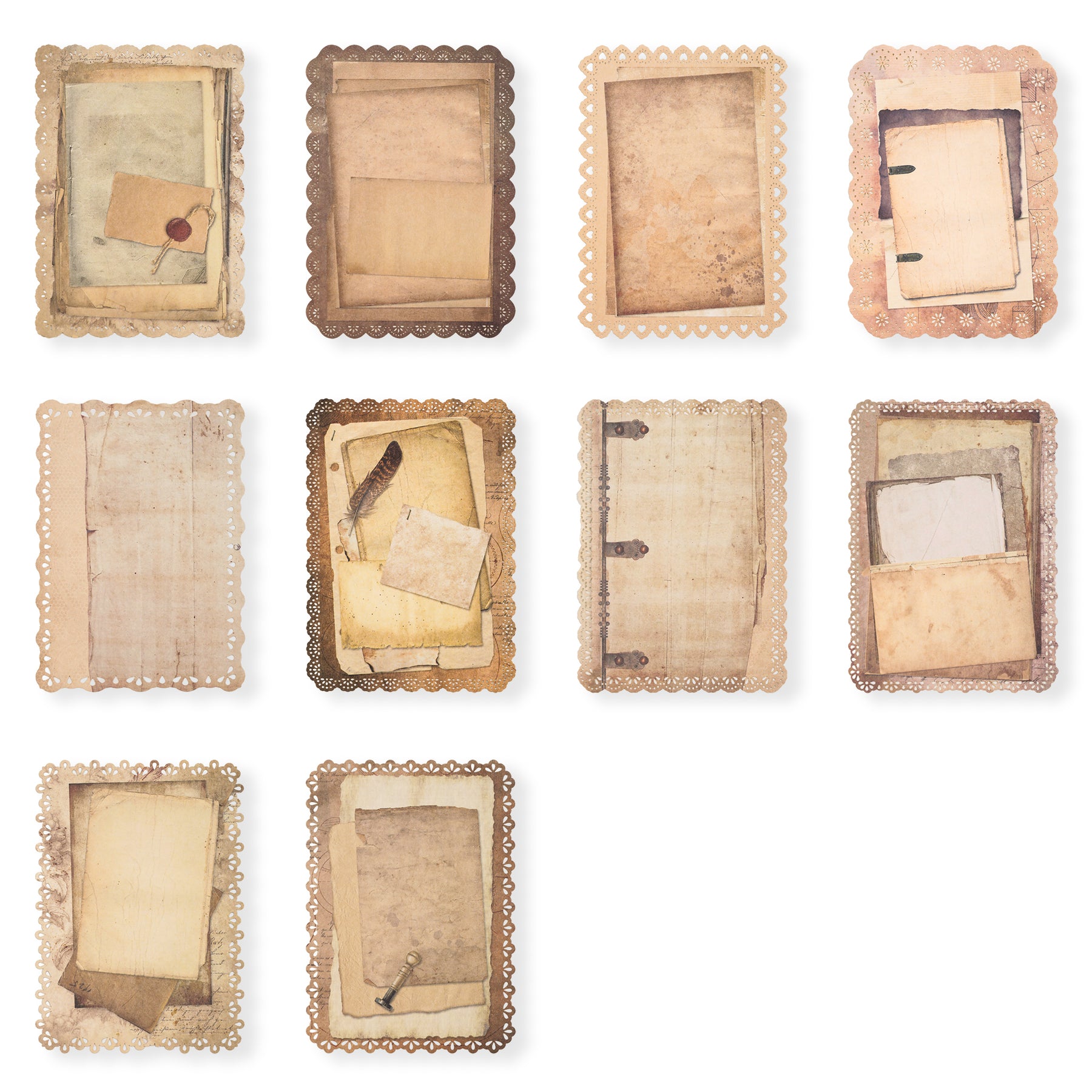 This set includes 60 sheets of vintage-style scrapbook paper featuring flowers, butterflies, yellowed letters and stars pattern that adds an authentic aged look. Each sheet is bordered with a delicate lace cutout design, enhancing its nostalgic charm. Ideal for crafting, journaling, or decorative projects, these papers bring a refined, antique aesthetic to your creative work.