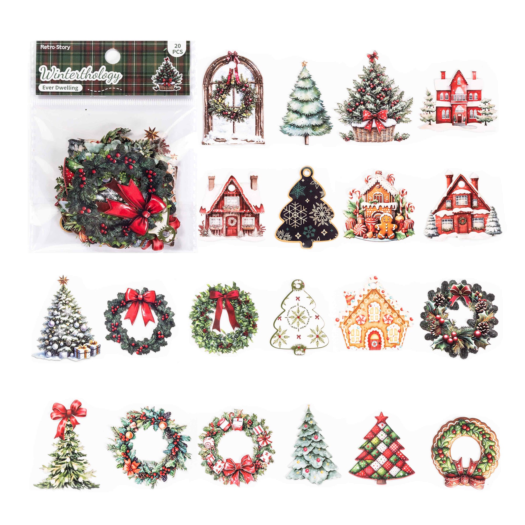 Elevate your holiday aesthetic with this 20-piece self-adhesive sticker collection. Featuring vibrant Christmas wreaths, gingerbread houses, and festive trees designed for seamless application on notebooks, bottles, and packages. The premium adhesive bonds securely while removing cleanly, making it an excellent choice for seasonal personalization and gift embellishment.