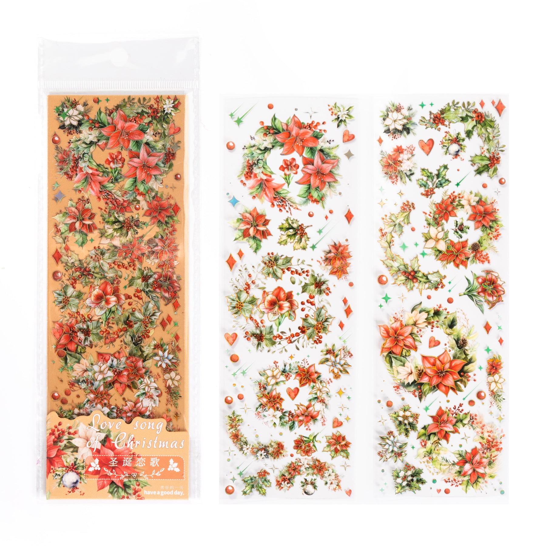 Love Song of Christmas I PET Stickers features two distinct designs showcasing festive wreaths and fresh florals rendered in dimensional holographic gold. Crafted from durable PET material, these stickers deliver a premium metallic finish that catches light beautifully. Perfect for holiday gift wrapping, card embellishment, or seasonal decoration projects. Each sheet offers versatile imagery ideal for creative applications throughout the festive season.