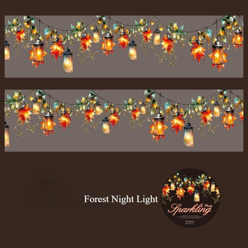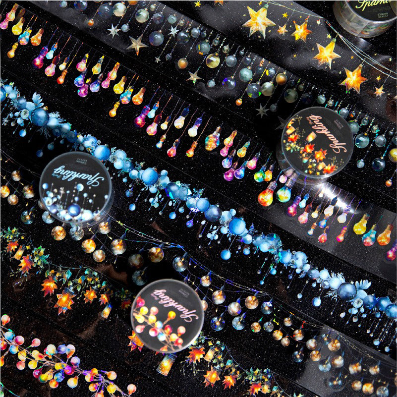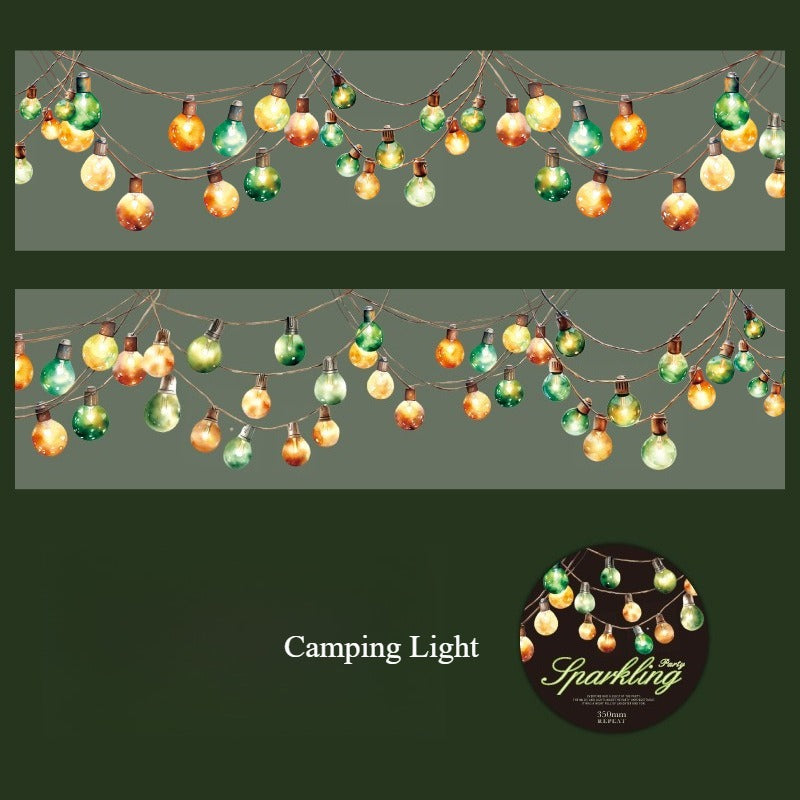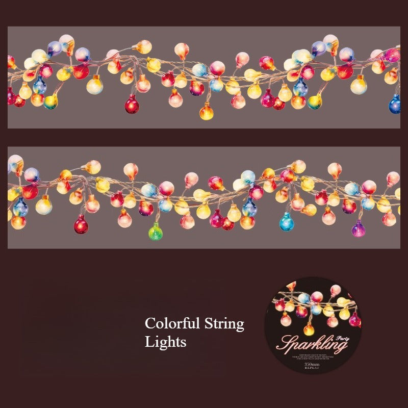 Transform your bullet journal spreads and party planning pages with Sparkle Party PET Tape. This decorative tape features eight distinct string light designs printed on durable PET material, perfect for adding festive flair to bujo layouts, scrapbooks, and craft projects. Each style captures the warmth of twinkling lights—ideal for seasonal themes, event planning, and creative embellishment.
